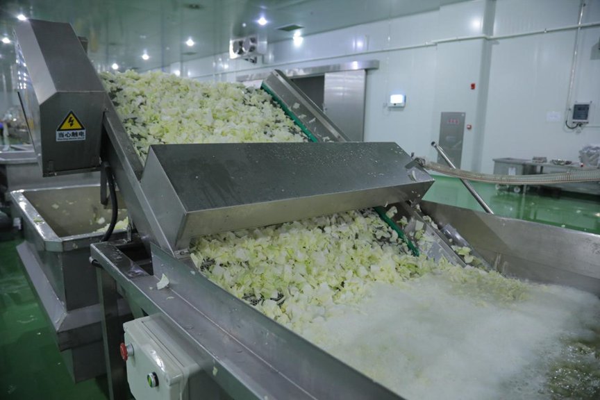 步入大象连云港工厂车间,自动化与精益管理贯穿生产全流程。黄心白菜作为泡菜核心原料,从进入原料库起便开启“精细化处理”:由自动除根设备精准剔除根部与外层坏叶,随后经鼓泡喷淋清洗系统完成2次深度清洁,确保无杂质残留;切割环节由数控设备依据产品规格精准分割,确保每片菜叶大小均匀;灌装与包装环节全程由机械化操作,减少人工接触污染风险,罐装、袋装等多种包装形式,满足零售与餐饮的多重需求。